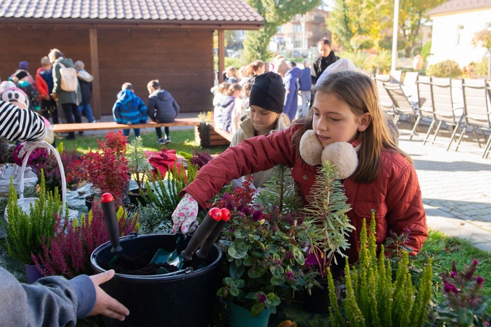 Cudownie słoneczna i ciepła jesień zaprosiła 8 października 2024 r. uczestników projektu „Zielone lekcje w ogrodzie” do naszego szkolnego ogrodu! W ramach realizacji projektu ekologicznego, uczniowie klasy 3a i 3b Katolickiej Szkoły Podstawowej w Skawinie oraz uczniowie z Ośrodka, wzięli udział w kolejnym spotkaniu warsztatowym, poświęconym owadom zapylającym i roślinom miododajnym. W części edukacyjnej, uczestnicy poznali gatunki zapylaczy, które podobnie, jak pszczoły pełnią ogromnie ważną rolę w ekosystemach i umożliwiają zapylanie roślin kwiatowych. Podczas krótkiej prezentacji, młodzi ogrodnicy poznali także rośliny miododajne kwitnące jesienią oraz sposoby pomagania owadom w przygotowaniach do zimy. Była również okazja, aby się przekonać, jak kwiaty zwabiają owady zapylające i jakie strategie wykorzystują. Pięknie pachnąca lilia czy jaskrawo ubarwiona alstremeria to tylko niektóre sposoby kuszenia zapylaczy. Wykorzystaliśmy przepiękna pogodę i kolejną część zajęć zrealizowaliśmy w szkolnym ogrodzie. Nasi mili goście i uczniowie Ośrodka poznali różne narzędzia ogrodnicze oraz zasadzili rośliny cebulowe, które na wiosnę zakwitną całą feerią barw! Było wesoło, energicznie i z ogromnym entuzjazmem! Organizatorzy dowiedzieli się od przyszłych przyrodników mnóstwa ciekawostek o roślinach i owadach i byli pod ogromnym wrażeniem tej wiedzy! Prace poszły sprawnie, cebulki zostały troskliwie zasadzone i teraz czeka je już tylko zimowy odpoczynek pod warstwą ziemi. Będziemy (nie)cierpliwie czekać na efekty!