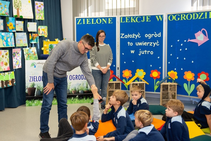 Druga część spotkania poświęcona była prezentacji projektu „Zielone lekcje w ogrodzie” oraz pierwszym zajęciom tematycznym, zatytułowanym „W niezwykłym świecie pszczół”. W warsztatach przyrodniczych wzięli udział także uczniowie Ośrodka i wspólnie ze swoimi rówieśnikami odpowiadali na pytania i odgadywali pszczele zagadki! Podsumowaniem spotkania była krótka karta pracy, będąca jednocześnie przygotowaniem do konkursu wiedzowego nt. zapylaczy, roślin miododajnych, ochrony naturalnych stanowisk dla owadów zapylających oraz możliwości wspierania i zachowania bioróżnorodności tej grupy zwierząt.