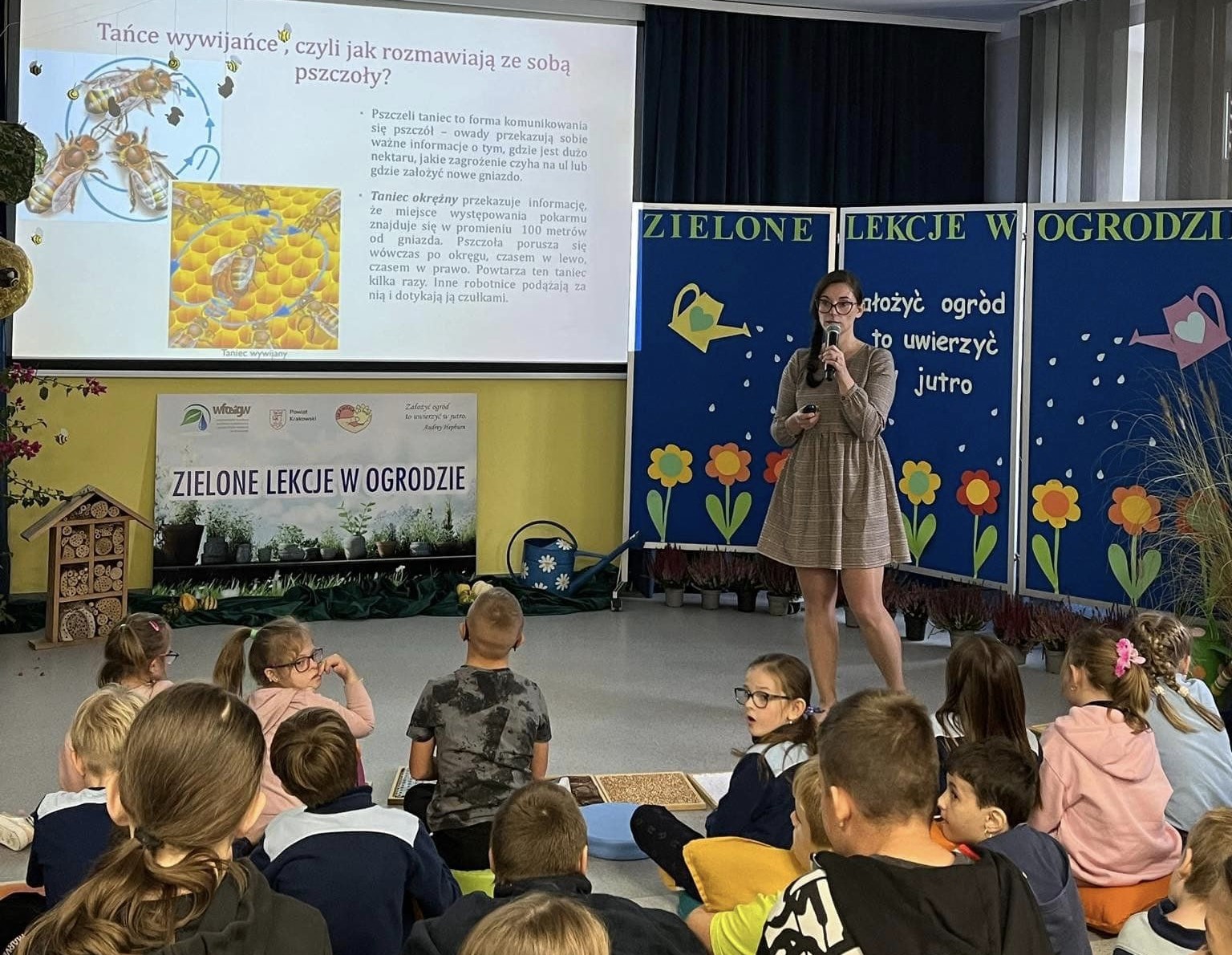 24 października 2024 r. odbyło się uroczyste podsumowanie projektu edukacyjnego „Zielone lekcje w Ogrodzie. W podsumowaniu cyklu zajęć edukacyjno - warsztatowych wzięli udział uczniowie klas 3a i 3b z Katolickiej Szkoły Podstawowej oraz społeczność szkolna Ośrodka. Podczas spotkania odbył się quiz wiedzowy - pytania były trudne i szczegółowe, jednak nie tak trudne, aby zaskoczyć wszystkich zebranych uczestników! Nad poprawnością udzielanych odpowiedzi czuwał zaproszony pszczeli specjalista - pan Kornel Apostolik, który nie tylko wie wszystko o pszczołach, ale zaraża nas pasją do pszczelarstwa! I trzeba przyznać, że również był zaskoczony wysokim poziomem wiedzy dzieciaków! Jeśli zapytacie, skąd to wszystko wiedziały, to oczywiście odpowiemy, że z zajęć, które zostały zrealizowane w ramach całego projektu!