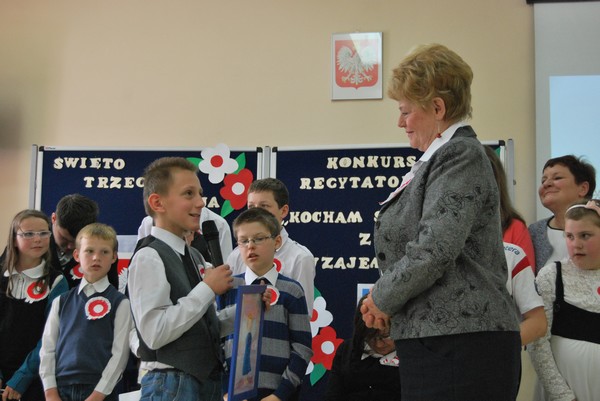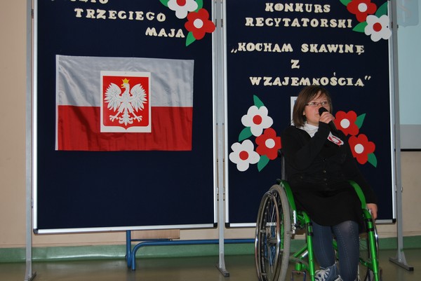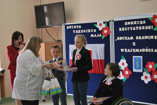 Następnie przedstawiono prezentację multimedialną o wydarzeniach sprzed ponad dwóch wieków, a także stare fotografie pokazujące jak obchody Konstytucji 3 Maja w Skawinie w okresie międzywojennym i powojennym. Kolejnym etapem uroczystości był konkurs zatytułowany „Kocham Skawinę z wzajemnością”, w czasie którego uczniowie recytowali wiersze o Skawinie napisane przez ich rówieśników ze szkół masowych. Poziom konkursu był niezmiernie wysoki i wyrównany, ale po burzliwych naradach jury przyznało dwa wyróżnienia dla uczniów Karoliny Ogrodowskiej i Aleksandry Wróbel oraz trzy pierwsze miejsca dla Magdaleny Hrabii, Mateusza Gębczyka oraz Andżeliki Monicy. Wszyscy uczestnicy konkursu otrzymali nagrody. Na koniec laureaci konkursu pozowali do wspólnej fotografii, która będzie miłą pamiątką i wspomnieniem. Uroczystość przygotowały nauczycielki Małgorzata Spólnik i Anna Sulejman.